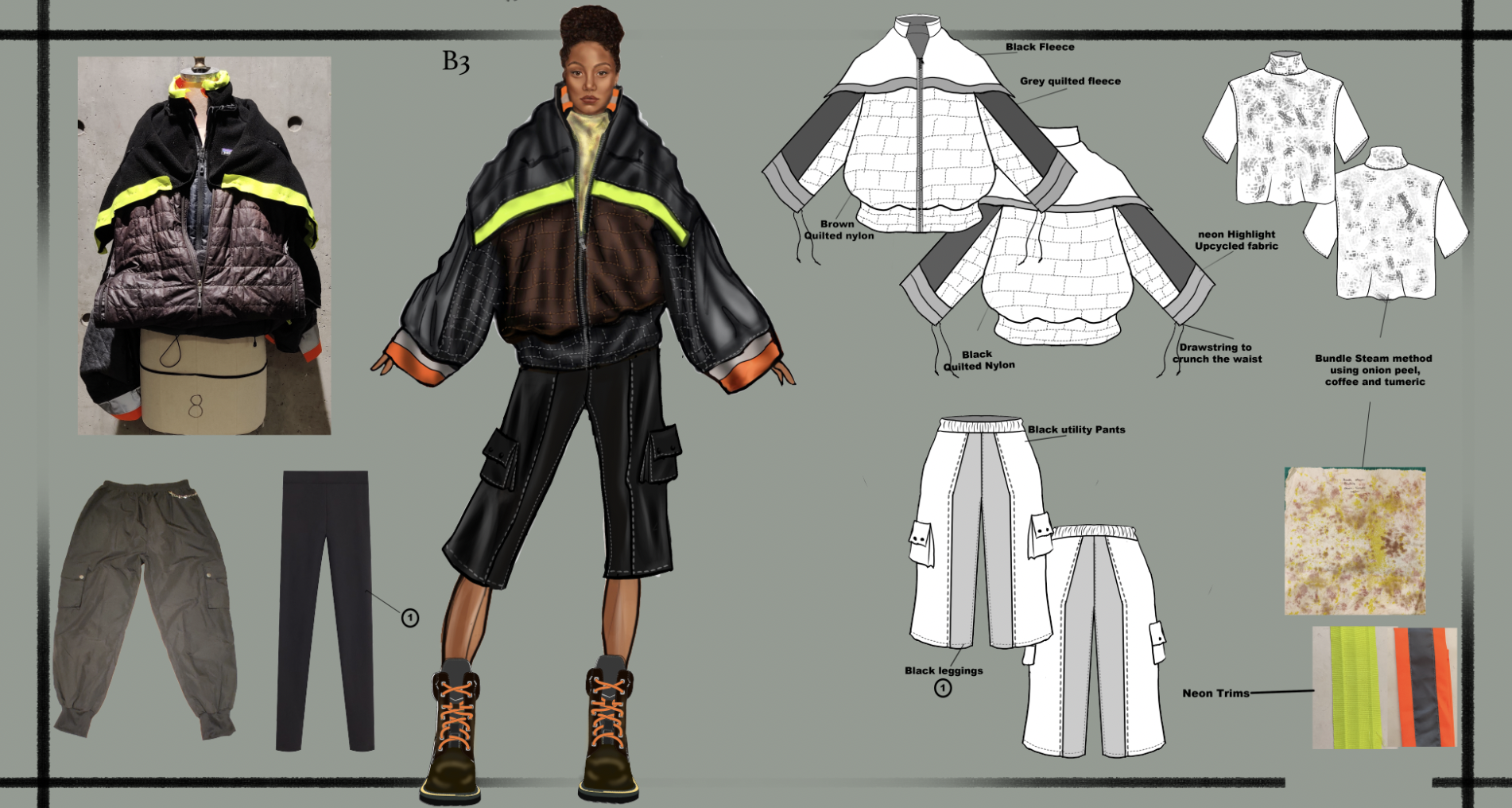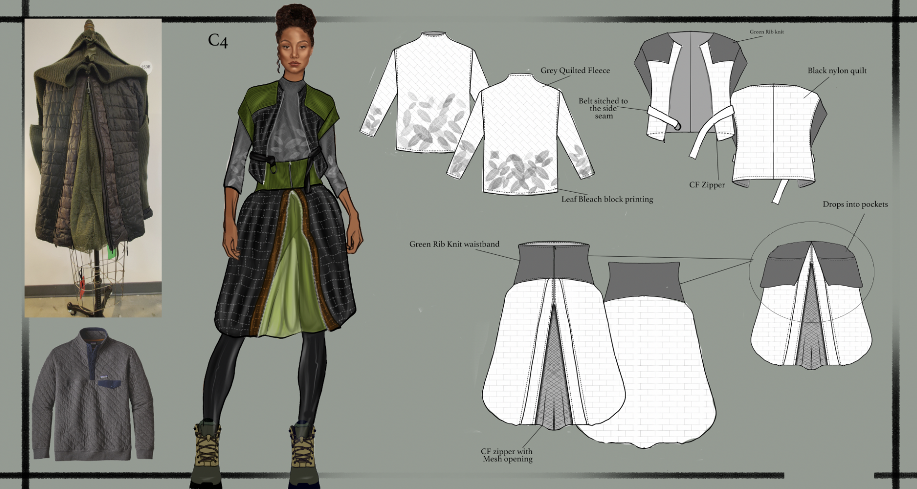 This collaboration with Patagonia was a masterclass in circularity, and it was a distinct privilege to work under the guidance of Kourtney Morgan, Patagonia’s Senior Designer. My primary objective was to transform worn-out, "unwearable" jackets into high-performance, multipurpose garments specifically engineered for the modern hiker. The process presented a significant technical challenge: rather than working with a blank canvas, I had to perform a "surgical deconstruction" of pre-existing items, navigating fixed seam lines and damaged zones to harvest viable materials. Strategically nesting new patterns into these irregular silhouettes required a complex optimization of every square inch to ensure maximum yield and zero waste. By integrating salvaged technical components with new utility-focused features, I developed a "New Heritage" piece that honors Patagonia’s rigorous durability standards while proving that upcycling is a premium, industrial-grade solution for the future of the trail.